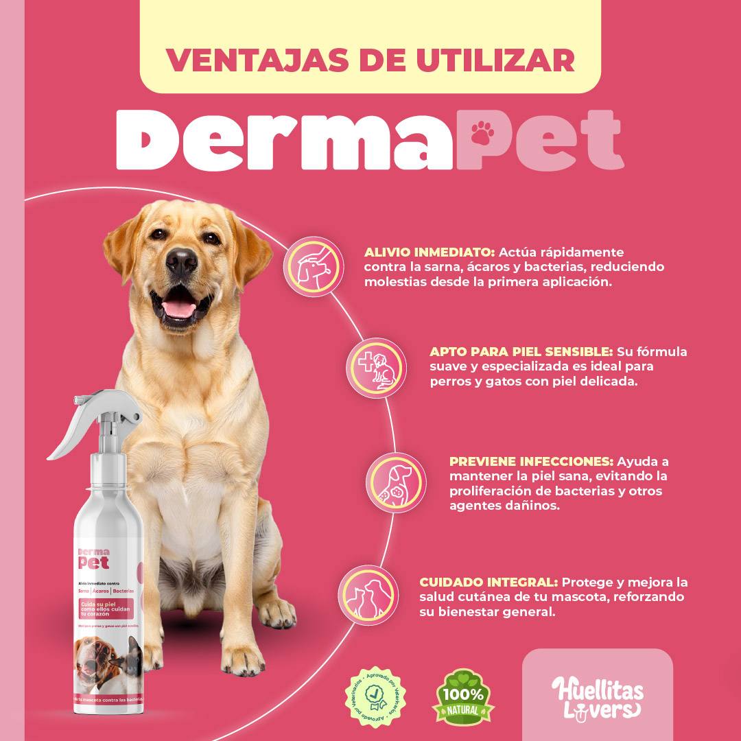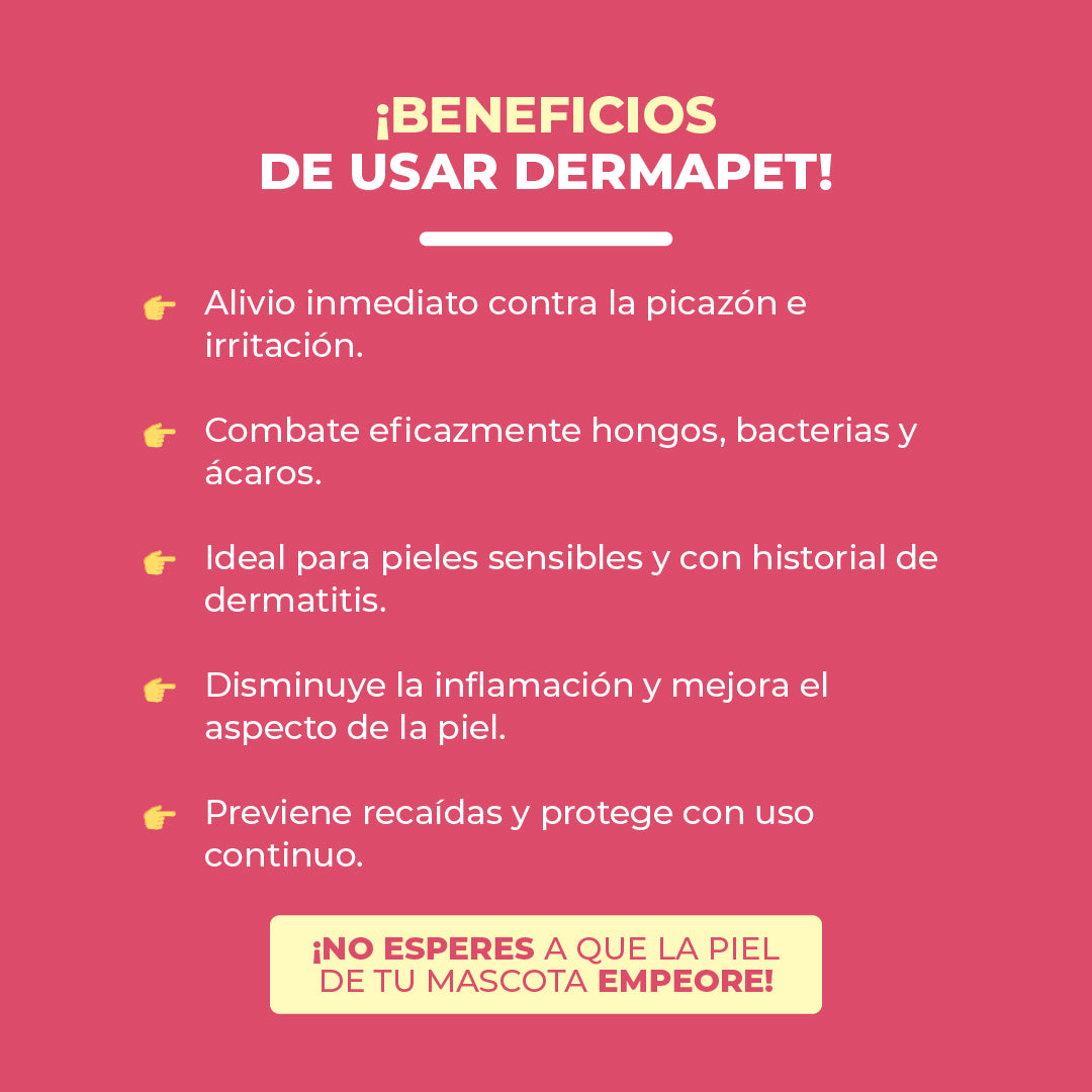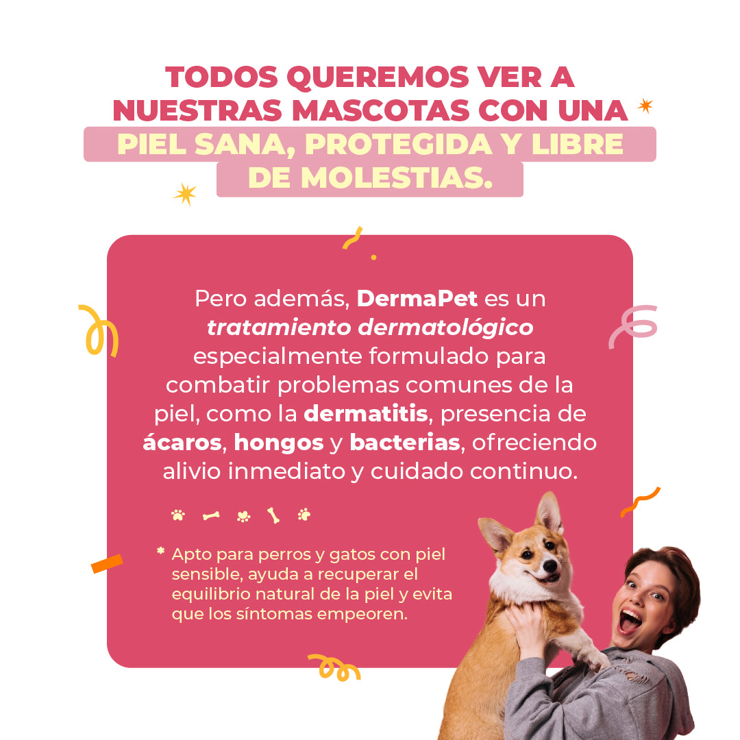DERMAPETIS Solución Tópica te ayudará con la limpieza de piel, pelaje, patas y orejas de tu mascota.